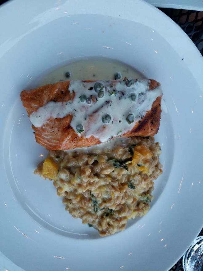 Previous ImageNext Image 20180808_195524 Grilled salmon with kale, butternut squash, and farro risotto
