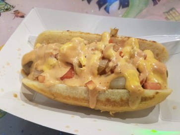 Vegan dog made with apples, potatoes, and sage topped with grilled onions, tomatoes, sriracha mayo and special sauce. Yum!