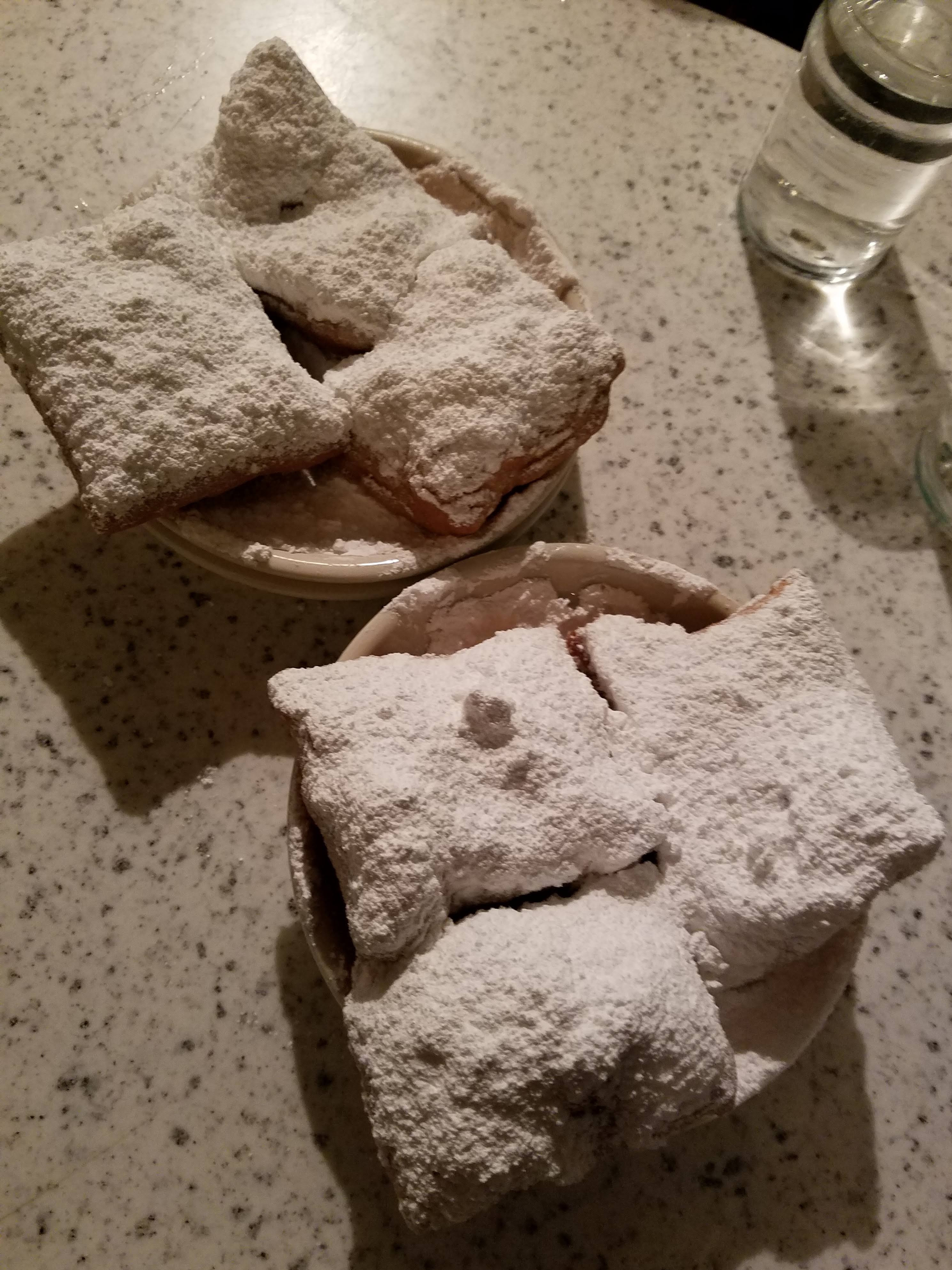 Previous ImageNext Image 20190121_235327-1 Piping hot beignets dunked with powdered sugar from Cafe Du Monde